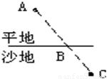 如图,小明从家A点到达学校C点必须经过一片平地和一片沙地(平地行走速度大于沙地行走速度),他应选择怎样的路径最快捷?小明利用光学知识确定应从______处由平地进入沙地(选填“B点”、“B点左侧”或“B点右侧”),请你大致画出他的行进路线.