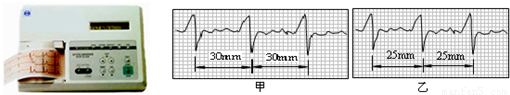 心电图仪(如图所示)通过一系列的传感手段,可将与人心跳对应的生物电流情况记录在匀速运动的坐标纸上.医生通过心电图,可以了解到被检者心跳的情况,例如,测量相邻两波峰的时间间隔,便可计算出1min内心脏跳动的次数(即心率).同一台心电图仪正常工作时测得待检者甲、乙的心电图分别如图甲、乙所示.若医生测量时记下被检者甲的心率为80次/min.则: