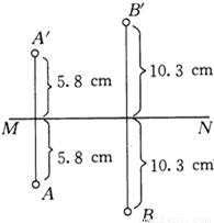 在“研究平面镜成像特点”时,某同学利用一块玻璃板代替平面镜,图中所示是这位同学做完实验后在白纸上留下的记录,其中MN是他实验时画出的玻璃板的位置,A、B是两次实验中点燃的蜡烛所在的位置,A´、B´,分别是他找到的蜡烛的像的位置.