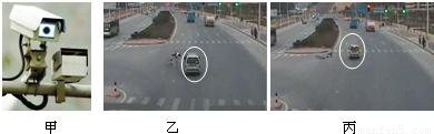 (选填“照相机”、“投影仪”或“放大镜”)相似.如图乙和丙是一辆汽车经过路口时与一辆自行车相撞后被先后拍下的两张照片,由图可以看出汽车是逐渐
