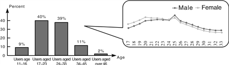 【1】According to ChartⅠ, what age is male users more than female users from?