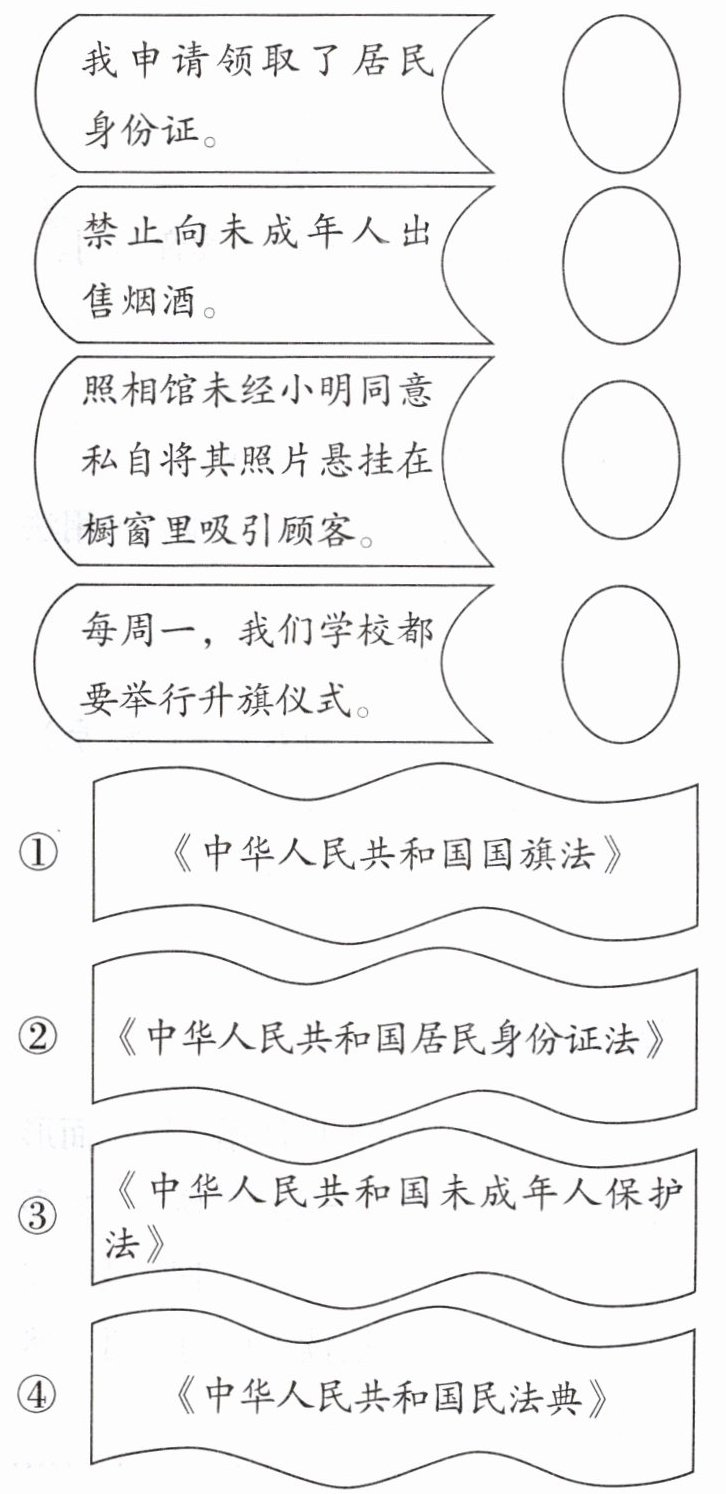 “申请领取居民身份证”对应《中华人民共和国居民身份证法》;“禁止向未成年人出售烟酒”对应《中华人民共和国未成年人保护法》;“照相馆未经同意悬挂照片”涉及肖像权,对应《中华人民共和国民法典》;“举行升旗仪式”对应《中华人民共和国国旗法》。