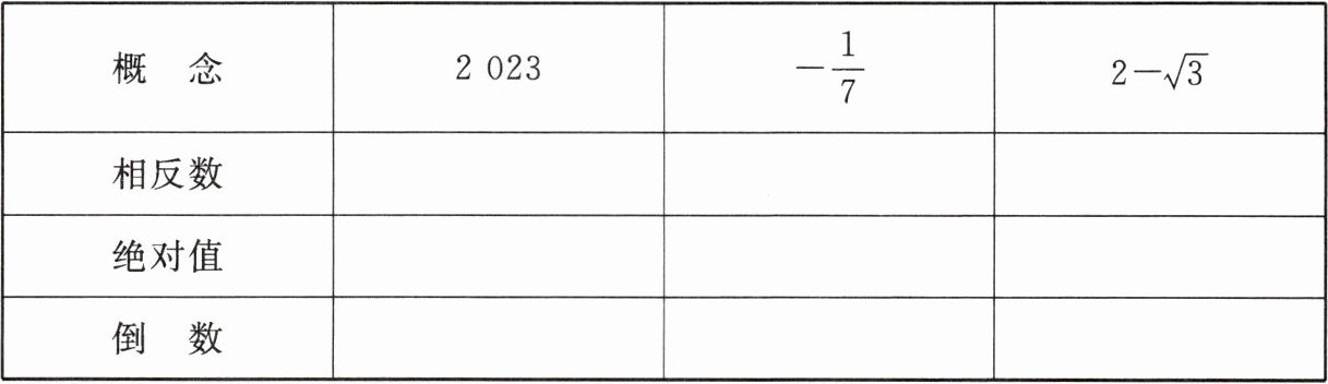 |倒数|$\frac{1}{2023}$|-7|$2 + \sqrt{3}$|