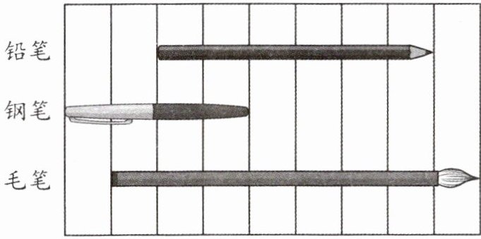 通过观察插图,数出每种笔所占的格子数。铅笔占6格,钢笔占4格,毛笔占7格。比较可得7>6>4,所以毛笔最长,钢笔最短。