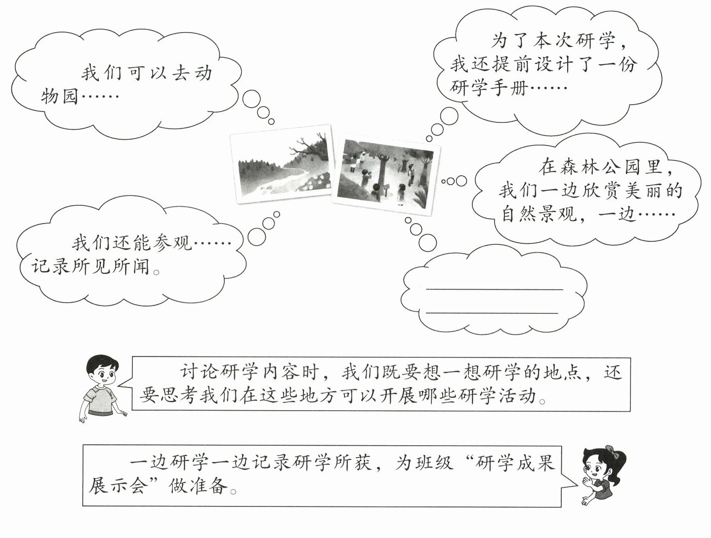 讨论研学内容时,我们既要想一想研学的地点,还要思考我们在这些地方可以开展哪些研学活动。