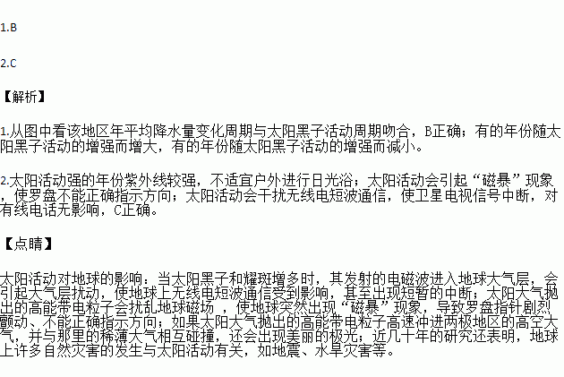 太阳活动变化的最长久纪录是太阳黑子的变化,太阳黑子活动的变化会对地球的气候产生明显影响,大约在1900年,研究人员开始探索太阳活动和地球上天气间的关联性。下图显示某区域太阳黑子活动与年均降水量的关系。读图回答下列各题。