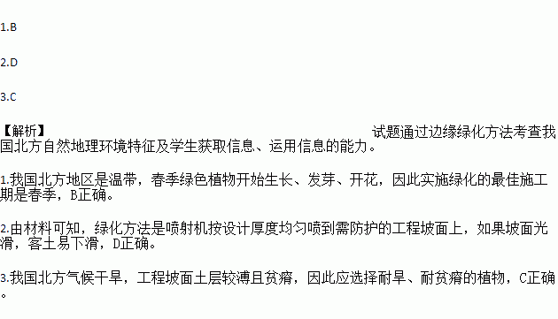 边缘绿化客土法是将草种、肥料、保水剂、土壤、有机物、稳定剂等物质充分混合后,通过喷射机按设计厚度均匀喷到需防护的工程坡面上,以达到近似于自然景观的一种绿化方法。据此回答下列各题。