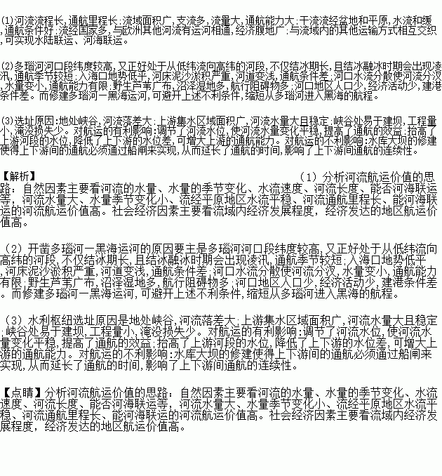 (3)、铁门水利枢纽是多瑙河上集发电、航运于一体的大型水利枢纽,试分析铁门水利枢纽选址于图示位置的原因,并评价其对多瑙河航运发展的影响。