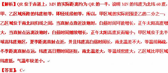 | 下图为局部经纬网图,甲、乙区域所跨的纬度相等,MN的实际距离约为QR的一半。