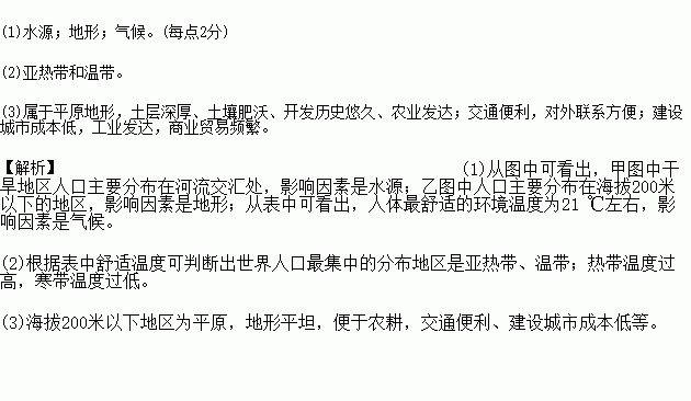 (3)解释乙图中人口集中分布在海拔0~200米的原因。