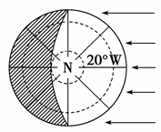 | (ÒªÇó£ºÔÚÏÂͼÖлæ³ö³¿»èÏߣ¬ÓÃÒõÓ°±íʾҹ°ëÇò²¿·Ö£¬±ê³öÖ±ÉäµãËùÔÚ¾Ïߵľ¶È)