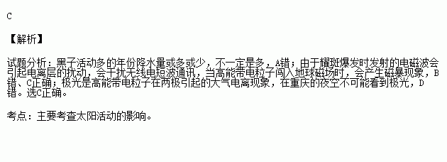 D.在重庆的夜空能清晰地看到太阳活动剧烈时所产生的极光