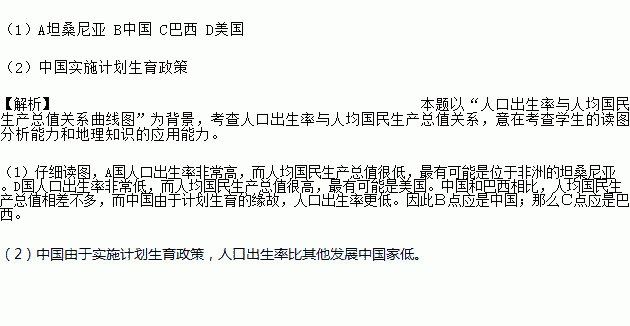 (1)图中A、B、C、D四点分别表示中国、美国、巴西、坦桑尼亚四国中的哪一个国家?