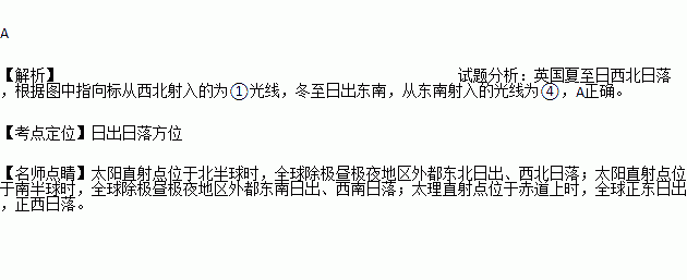 专家研究发现,英国巨石阵是一处古人天文观测遗址。在特定日期站在阵内的人可以看到日出、日落透过巨石缝隙的光线。下图为巨石阵示意图,图中代表夏至日日落和冬至日日出太阳光线的分别是