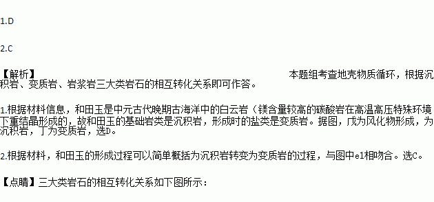 玉中之王”和田玉是中元古代晚期古海洋中的白云岩(镁含量较高的碳酸岩)在高温高压特殊环境下重结晶形成的。下图是地壳物质循环示意图,“甲→戊”表示岩浆和三大类岩石。据此回答下列各题。