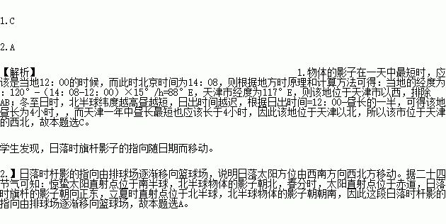 2.下列时段中,日落时杆影的指向由排球场逐渐移向篮球场的是