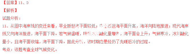 图6为全新世(开始于11.5万年前)以来福建省南部局地海岸变迁状况示意图,如果仅考虑气候变化对海岸变迁的影响,则全新世以来该地气候冷暖变化特征是( )