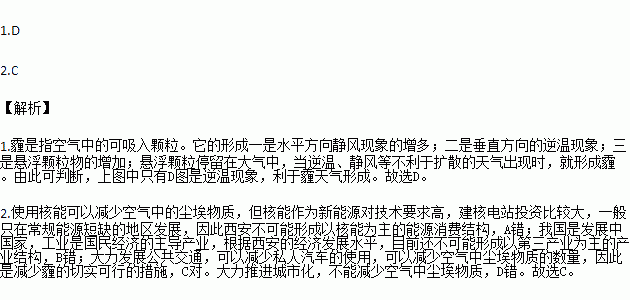 2016年12月19日,西安市中小学及幼儿园首次因霾引起的大气严重污染停课三天。2017年1月1日18时,西安市因静稳环流形势维持,霾天气持续,无明显降水、降温天气,近地面相对湿度较大,并伴有逆温现象,大气污染物扩散条件差,空气质量严重污染。而启动重污染Ⅰ级响应,自1月3日起,中小学及幼儿园再次因霾停课。据此完成下面小题。