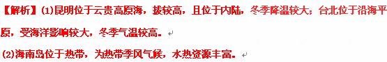 ¡¾´ð°¸¡¿ (1)µØÐΣºÀ¥Ã÷µØ´¦(ÔÆ¹ó)¸ßÔ£¬Ì¨±±µØ´¦Æ½Ô(1·Ö)£¬µØÊƸߵͲîÒìµ¼ÖÂÆøÎ²îÒì(1·Ö)£»Î»ÖãºÀ¥Ã÷λÓÚÄÚ½£¬Ì¨±±Î»ÓÚÑØº£(1·Ö)
