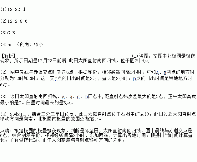 (1)左图所示日期是__月__日前后,此日太阳直射点位于图2中a、b、c、d哪一点?______。