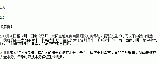 2011年11月28日至12月11日,联合国新一轮气候变化大会在南非东部海滨城市德班召开。右图为甲地高大的猴面包树,其粗大的树干能储存水分,适应环境变化,维持生命活动。结合图文资料回答下面小题。