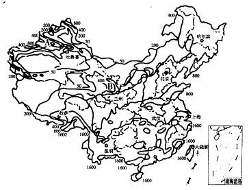 (5分)读我国年降水量分布图,回答下列问题。![]()