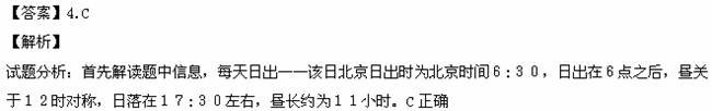 某日北京时间6:30天安门广场国旗准时升起(每天日出时刻升起),则北京的昼长约为