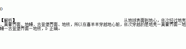 若动画片《喜羊羊与灰太狼》的喜羊羊一天来到美丽的大蜀山,它突发奇想 “遁地”前往地球另外一侧去看看,如果它始终保持直线前进并穿越地心。在喜羊羊穿越地心前,依次穿越的是( )