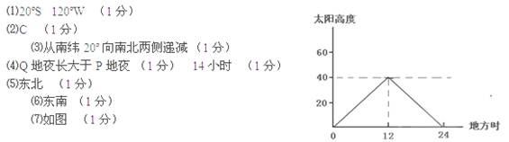 (5)在下图中画出此日Q地对跖点的太阳高度随时间变化的情况(用折线)。(4分)