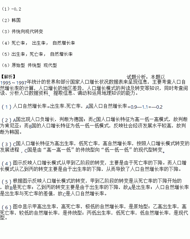 读1995~1997年统计的世界和部分国家人口增长状况数据表,回答下列问题。