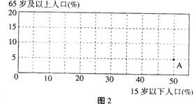 (3)根据表格提供的数据,在图2中标出A点,以表示A国15岁以下、65岁及以上人口年龄构成。![]()