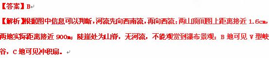C.陡崖处可观赏到瀑布景观 D.B地可见V型峡谷,C地可见三角洲