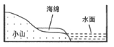 在两个相同的长方形塑料盒子的一端用潮湿的土壤分别搭起一座相同坡度的“小山”,从盒子的另一端倒入等量的水,形成“湖泊”;不同的是在其中一个盆子内,将一块微湿的海绵压入“小山”底端的土壤里(见图)。分别用两个喷水壶,往“小山”上洒等量的水,模拟降水。