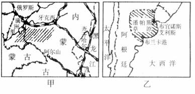 读我国内蒙古呼伦贝尔牧区(甲)和阿根廷潘帕斯牧区(乙)分布示意图,回答下题。