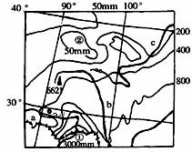 乙图大致为甲图从A至B一线附近地形剖面图,图中虚线表示当地一次特大暴雨量分布状况,据图判断中最大暴雨量分布的地区海拔高度约为多少米?( )