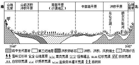 图为我国某盆地自然景观剖面图,读图回答问题。