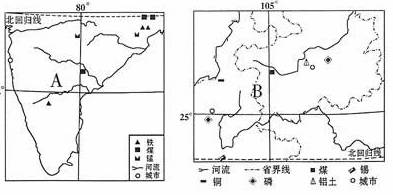 (3)简述A、B高原能源、矿产资源及工业部门的主要差异。