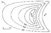 读图,图中等高线表示一种风力堆积的地表形态。回答(1)~(3)小题。