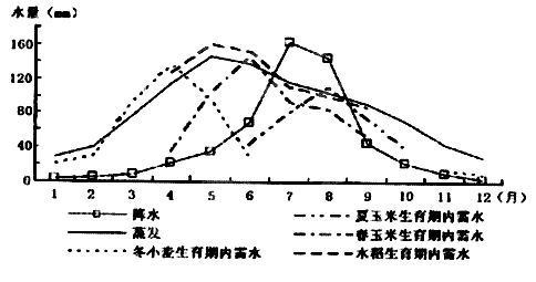 读我国某地多年月平均降水量、蒸发量与各作物生育期内平均需水量关系图,回答 7--8题。
