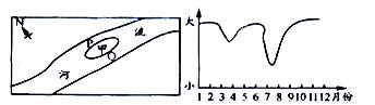 下图中,左图为我国某河流河道示意图,甲为一河心沙洲,右图为该洲一年内面积变化统计图,读图完成9-10题.