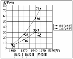 读“某国工业化、城市化进程比较图”,回答7~8题。