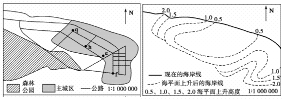 读“世界某沿海城市城区分布图和预计海平面上升高度等值线图”,回答6~7题。