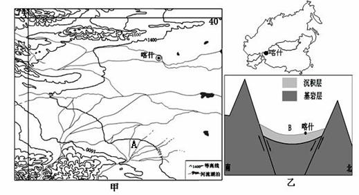 喀什是中国的西大门,是中西亚文化交融的城市、全疆最著名的古城。图17中甲、乙两图为喀什所在区域图和地质剖面图。