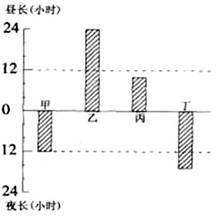 下图表示某日四地的昼夜长短示意图,回答7~8题。