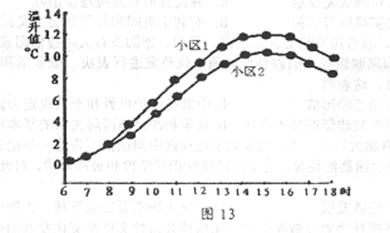 材料二 图13中小区1为下垫面吸收率较高的小区,平均吸收率为0.74;小区2为下垫面吸收率较低的小区,平均吸收率为0.64。