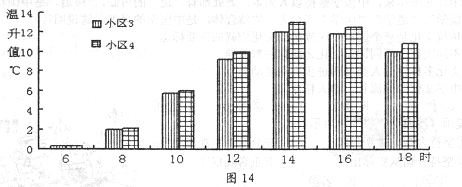 城市四个住宅小区的环境进行观察测算,得到了白天(晴天)6: 00至18: 00的温升数据并绘制了图13、图14.(基准温度取某日平均温度)
