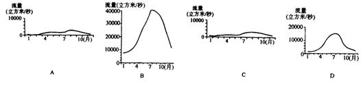 (4)下面四图为我国长江、黄河、松花江、珠江四条河流流量对比图,请根据这四条河流水文特征,判断A、B、C、D四图哪条河流代表黄河 。