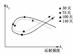 判读卫星遥感图像时常使用对比分析法,具体说就是对不同时间、不同地面物体的卫星图像进行对比和分析。如下图,虚实两线分别代表玉米和大豆两种农作物在不同时间对两种不同电磁波的反射强度(图中符号分别代表播种30、75、100、140天后两种农作物反射的电磁波强度)。读图回答1-2题。