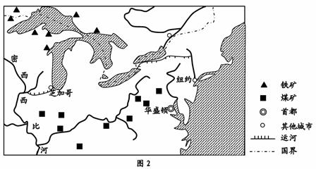 芝加哥是美国五大湖区最大的城市,其位置见图2。1848年修通联系密西西比河水系和五大湖的运河,随后兴建铁路并形成以芝加哥为中心的放射状铁路网。这段时期,芝加哥工业主要有农产品加工、农具、交通工具等生产部门。1890年,芝加哥人口达到100万。20世纪上半叶,芝加哥发展以钢铁为主导的重工业,并成为20世纪美国最大的钢铁工业基地。据此完成14~16题。