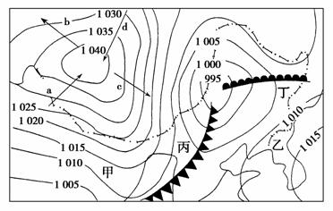 C.丙地,狂风暴雨电闪雷鸣 D.丁地,阴雨绵绵